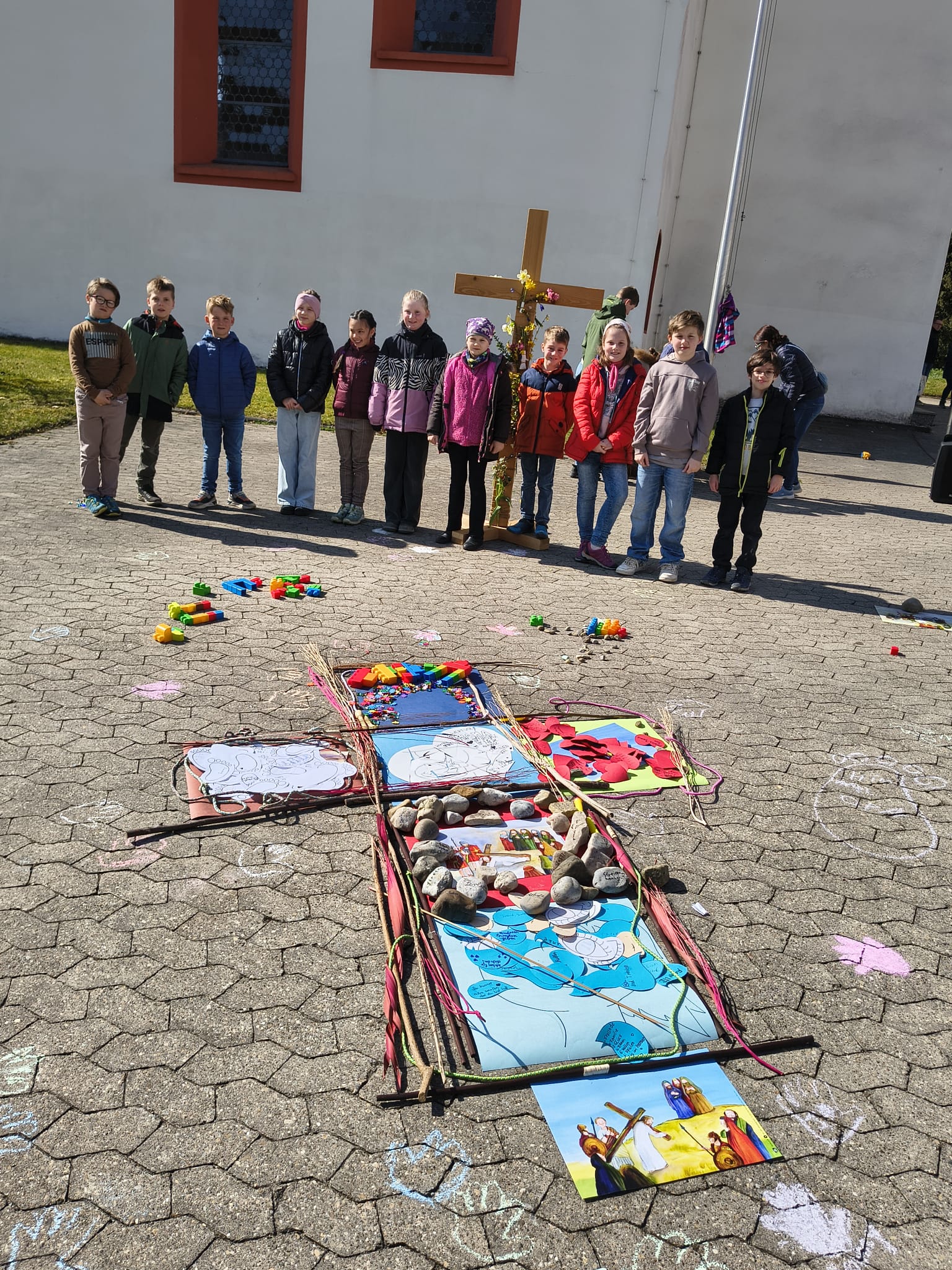 Am Karfreitag luden die Erstkommunionkinder aus Dürmentingen, Hailtingen und Heudorf sowie das KiGo Team zum interaktiven Kinderkreuzweg ein. Was zählt eigentlich wirklich in meinem Leben? Diese Frage führte durch den Kinderkreuzweg wie ein roter Faden. Hin und wieder ist es wichtig, in sich zu gehen und sich ganz bewusst diese Frage zu stellen. Als Erwachsener wird man gelegentlich zu dieser Frage gezwungen – durch Erfahrungen, Lebensumbrüche oder weil ein Kind eine solche Frage stellt. Kinder stellen uns diese Fragen, denn wir sind ihre Wegbegleiter. Wir alle sind einander Wegbegleiter. Auf dem Kinderkreuzweg begleiteten wir Jesus auf seinem (Kreuz)Weg. An jeder der sieben interaktiven Station stellten wir uns die Frage, was wichtig ist in unserem Leben oder man kann auch sagen, „was wirklich zählt“ und „was können wir tun?“ Wir durften Jesus auf seinem Weg begleiten und konnten ihm nahe sein. Verschiedene Stationen und Situationen seines Kreuzweges wurden kindgerecht dargestellt und erklärt. Dabei wurden sieben seiner Stationen genauer unter die Lupe genommen und mit heutigen Situationen und Ereignissen verbunden. So trat Jesus für seinen Glauben ein, verleugnete ihn nicht und war sich und Gott treu, obwohl er wusste welche Folgen es für Ihn hat. Zu Beginn durften die Kinder aus farbigem Tonkarton, Seilen, Stöcken und Steinen ein Kreuz legen, welches an den einzelnen Stationen gefüllt und dekoriert wurde. Bei der 1. Station „Reden und Schweigen“ sollten sich die Kinder den Mund zu halten, in sich gehen und spüren, wie es sich anfühlt nicht für sich oder für andere einstehen zu können. Kurz danach, die „Befreiung“, jedes Kind durfte seine Gedanken aufschreiben wie sie für sich oder andere einstehen. Wichtige Eigenschaften wie Zusammenhalten, Respektieren, Aufstehen, Erinnern sowie Hoffen und Glauben wurden in den weiteren Stationen von den Erstkommunionkindern erklärt. Doch nicht nur Respekt und Zusammenhalt unter uns Menschen ist wichtig. Auch der Respekt und die Verantwortung gegenüber unserer Natur, den Tieren – der Erde spielt eine große Rolle. Als Zeichen des Friedens wurde ein Regenbogen aus vielen verschiedenen bunten Sachen gelegt. Während des Kinderkreuzweges wurde auch an unsere Verstorbenen gedacht, sowie Menschen oder auch Tiere welche vermisst werden. Zum Zeichen der Hoffnung, des Glaubens und der Auferstehung durften die Kinder das Holzkreuz mit Blumen bestücken. Doch was hat dies alles mit dem Kreuzweg Jesu zu tun? Und warum die Fragen „was wirklich zählt“ und „was können wir tun?“. Jesus ist ein Teil von uns. Er ist für uns, für seinen und unseren Glauben gestorben. Er war mutig und voller vertrauen. Mutig, um für sich und uns alle einzustehen. Der Glaube an Gott, gab ihm dieses unendliche Vertrauen und den Mut. Ja, was zählt nun in unserem Leben und was kann jeder Einzelne dafür tun? Schlussendlich liegt es an uns selbst mutig zu sein, zu vertrauen. Für uns und andere einzustehen. Selbst wenn wir es nicht aussprechen (trauen) oder handeln, so wissen wir tief in unserem Herzen was wirklich zählt. Seid mutig und vertraut!
