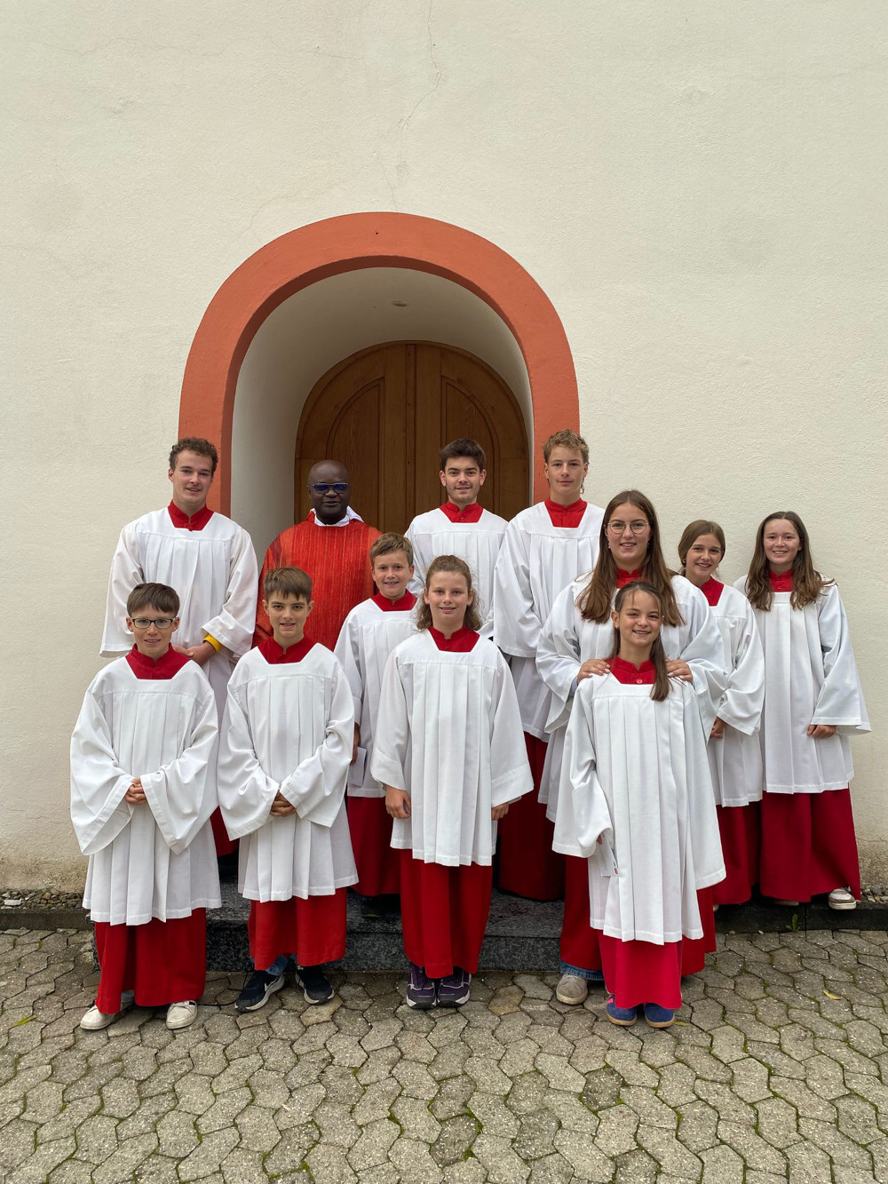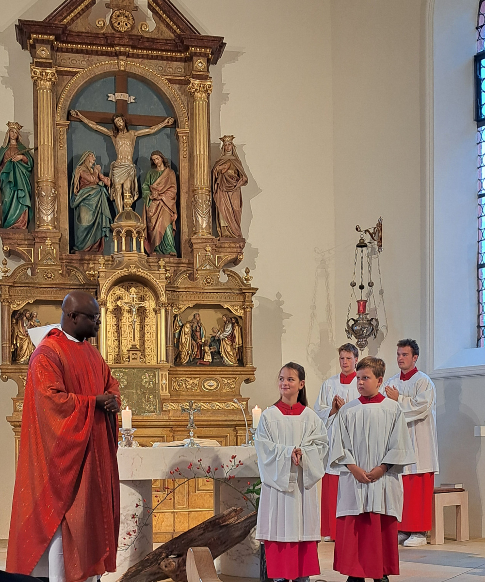Vergangen Sonntag war im Gottesdienst mit Pfarrer Leonard feierliche Ministrantenaufnahme und – Verabschiedung. Sophia und Simon, die Erstkommunionkinder dieses Jahres, haben sich in den Dienst am Altar rufen lassen. Den beiden wünschen wir viel Freude und Gottes Segen bei ihrer neuen Aufgabe. Verabschiedet aus dem Ministrantendienst wurden Thomas und Franziska. Thomas war neun Jahre, Franziska acht Jahre – davon drei Jahre als Oberministrantin – bei unseren Ministranten. Wir danken euch recht herzlich für die vielen Stunden, die Ihr mit eurem Dienst unser Gemeindeleben bereichert habt und wünschen für die Zukunft alles Gute. Viele unserer Ministranten waren beim Gottesdienst anwesend und zeigten so auf ihre Weise, dass sie die Neuen willkommen heißen und den beiden Scheidenden einen würdigen Abschied bereiten mochten.