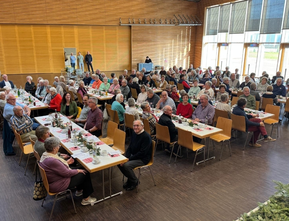 Am Samstag vor dem ersten Advent luden die katholische und evangelische Kirchengemeinde und die bürgerliche Gemeinde zur gemeinsamen Adventsfeier in die Kulturhalle ein und erfreulicherweise nahmen über hundert Seniorinnen und Senioren an der Feier teil. Pfarrerin Julia Kaiser und Pfarrer Michael Stork begrüßten die Gäste herzlich und eine Abordnung des Musikvereins stimmte mit ihren Liedern gekonnt auf die Advents- und Weihnachtszeit ein. In ihrer anschließenden Ansprache ging Pfarrerin Julia Kaiser auf den Sinn und die Botschaft der Advents- und Weihnachtszeit ein und brachte zum Ausdruck, dass niemand einsam und alleine zurückbleiben darf. Alle sind eingeladen und aufgefordert aktiv gegen die Einsamkeit anzugehen, gemeinsam aufeinander zuzugehen und sich an der Gemeinschaft zu erfreuen und zu stärken. „Weihnachten ist dann, wenn niemand mehr alleine ist“. Diese Botschaft lässt sich auch schon aus dem Schöpfungsbericht im Buch Genesis herleiten, da Gott für Adam Eva erschaffen hat.  „Es ist nicht gut, dass der Mensch allein sei“. Zur Freude der Gäste stellten Heinz Renz als Gott, Pfarrerin Julia Kaiser als Adam und Pfarrer Michael Stork als Eva die biblische Geschichte in einem Anspiel dar. Im Anschluss erfreuten sich die Seniorinnen und Senioren am reichhaltigen Kuchenbuffett und nutzten die Gelegenheit die Gemeinschaft bei guten Gesprächen zu pflegen. Zu guter Letzt ging Herr Bürgermeister Jürgen Köhler in seinem Jahresrückblick auf die bedeutendsten Ereignisse der bürgerlichen Gemeinde ein und ermöglichte den anwesenden Gästen einen interessanten Einblick in das vergangene Jahr. Unser besonderer Dank gilt allen, die zum Gelingen dieses schönen Nachmittages beigetragen haben. Besonderer Dank gilt den Musikerinnen und Musiker des Musikvereins Ertingen, allen Spendern der leckeren Kuchen, Jonas Renz für die Bedienung der Technik und den Seniorinnen und Senioren für die großzügige Spende zugunsten der Kirchensanierung.