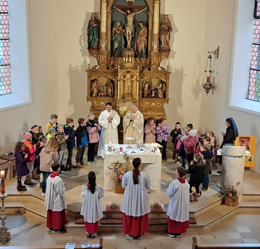 Einen sehr schönen Familiengottesdienst, ausgearbeitet von Sr. Christina vom Kindergarten, konnten wir am Sonntag, dem 9. November feiern. Nicht nur die Kinder des Kindergartens, auch die Erstkommunionkinder 2026 gestalteten diesen Gottesdienst mit. Mit Martinsliedern, bunten Laternen, der Mantelteilung, fröhlichen Kinder und vielen Kirchenbesuchern war dies ein toller Start in den Martinstag in Heudorf. Abends trafen sich alle wieder unter der großen Linde im Schlosshof. Beim anschließenden Laternenumzug führte Ruth Hering aus Burgau mit ihrem Pony den Zug an. Dank der Musikkapelle Heudorf waren die Melodien von der Spitze bis zum Ende des langen Zuges gut hörbar. Gespannt warteten alle im Anschluss auf das Martinsspiel, welches durch die „Martinsmänner“ wie immer perfekt dargeboten wurde. Zum Schluss wurden alle Laternenträger mit leckeren Heudorfer Monden belohnt. Auch die Versorgung mit warmen Getränken war bestens gewährleistet. So ging ein rundum gelungener Martinstag zu Ende.