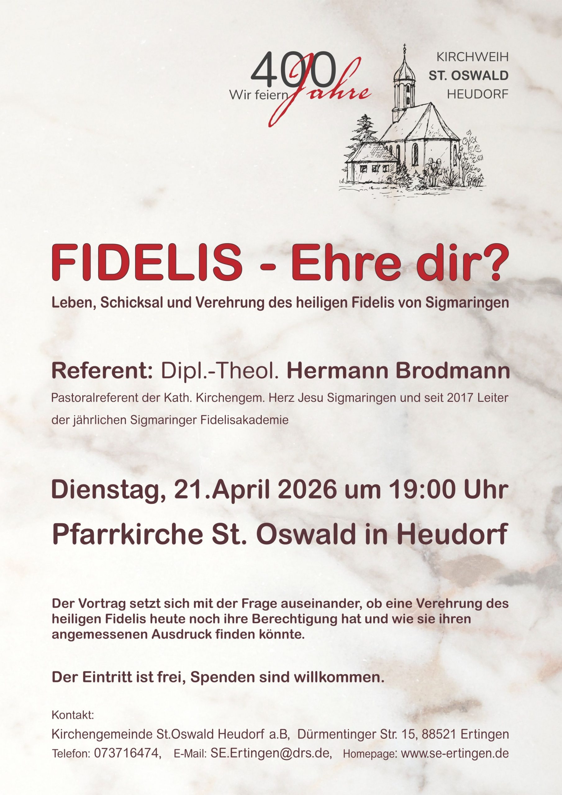 Es geht weiter in der Veranstaltungsreihe: Am 21. April um 19:00 Uhr folgt der Vortrag von Dipl.-Theol. Hermann Brodmann zum Thema: Titel des Vortrages: Fidelis – Ehre dir? Leben, Schicksal und Verehrung des Hl. Fidelis.