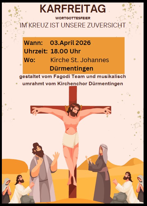Herzliche Einladung zur Wortgottesfeier am Karfreitag um 18:00 Uhr in der Pfarrkirche St. Johannes Ev. in Dürmentingen. Die Wortgottesfeier wird gestaltet vom Fagodi Team und musikalisch umrahmt vom Kirchenchor Dürmentingen.