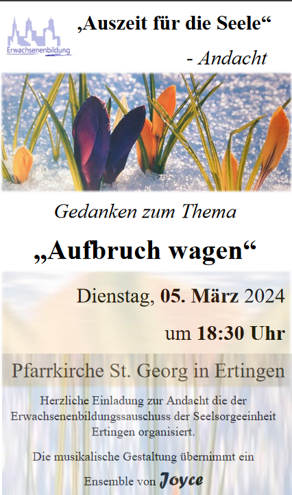 Am 1. Fastensonntag, dem 18.02.2024 sind Sie herzlich eingeladen zum Umkehr- und Versöhnungsgottesdienst zu Beginn der österlichen Bußzeit um 18:00 Uhr in der Pfarrkirche in Dürmentingen. In diesem Jahr trägt der Gottesdienst die Überschrift: „Kehr [...]