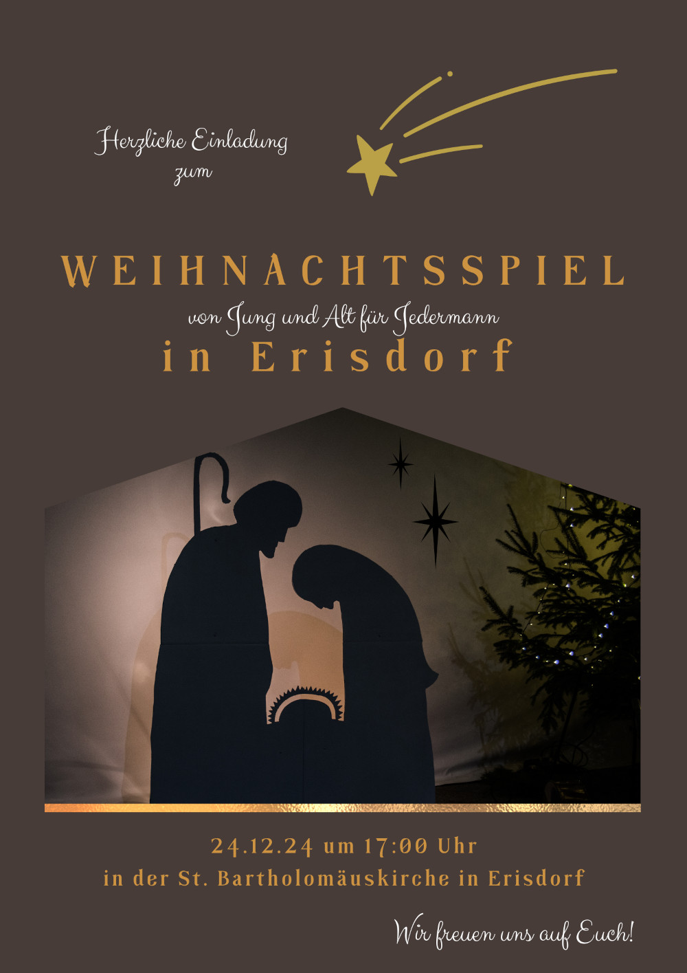 Wir laden Euch und Sie alle recht herzlich ein zum Krippenspiel in St. Johannes Ev. Dürmentingen am Heiligen Abend um 15:30 Uhr. Anschließend sind alle eingeladen zu Punsch und Gebäck. Es freuen sich die Kommunionkinder